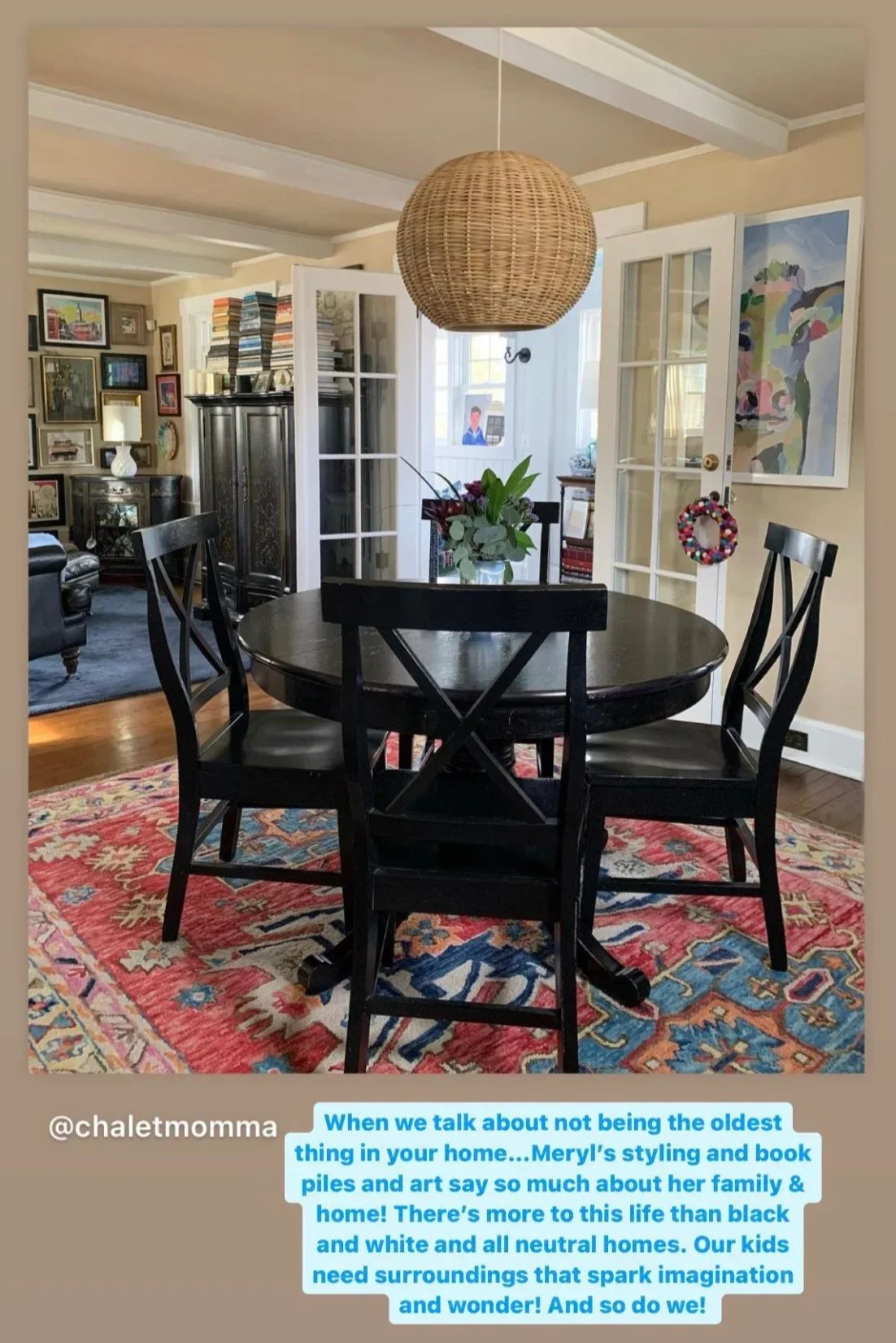 Her hashtag #saynotoemptywalls encourages everyone to embrace “The Walls the Limit” and adorn their spaces. Her two Instagram accounts are: @chaletmomma and @saynotoemptywalls