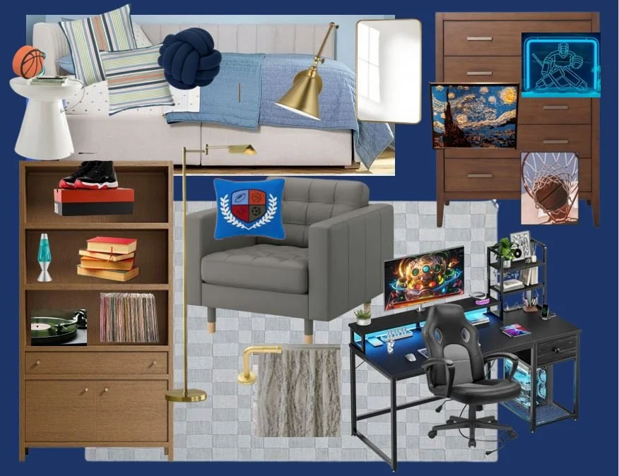 /Planning a room layout and sourcing pieces for a client is one of the most enjoyable aspects of my job. This week I’m sharing a Teenage Boy Design. I concentrated on Blues, Greys and Driftwood tonality of wood and brought in Brass accents. I had to use this cool side table with a built in charging station. Design is all about understanding the use of a space and bringing it to Life!