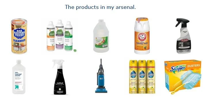 Rooms: Dust rag, swiffer, cleaning polish, vinegar, vacuum.
