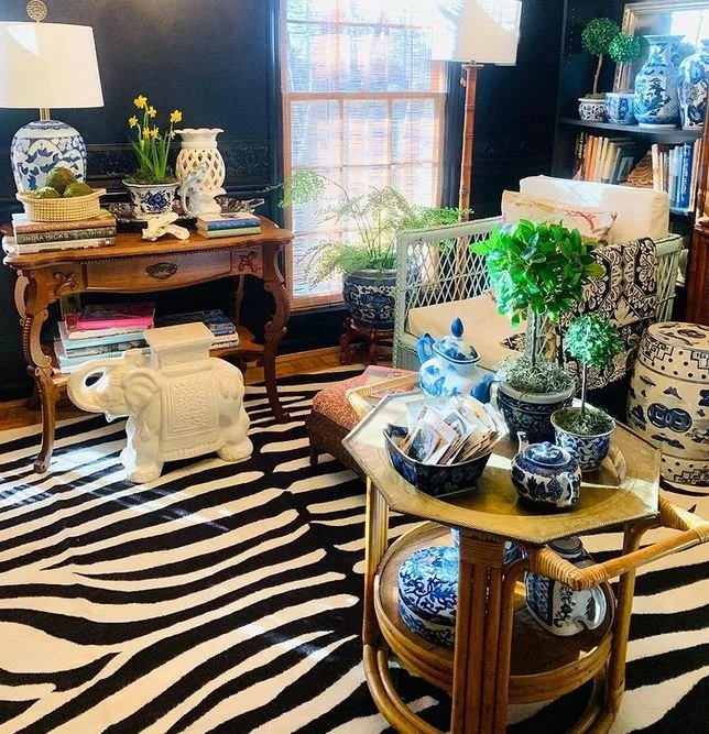 I know you love faux bamboo, zebra and chinoiserie touches. I love this view into your library - You were kind enough to use my hashtag on Instagram and I featured this image in my feed. In your original post you asked How many zebra rugs is too many? I would say there are never too many!