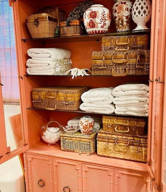 I have a lot of bamboo and rattan furniture thrifted over the years for amazing prices. The coral faux bamboo cabinet in the main bathroom was a great deal at $50.00. It was smoke stained when I got it but I cleaned and painted it and it’s one of my favorites now.