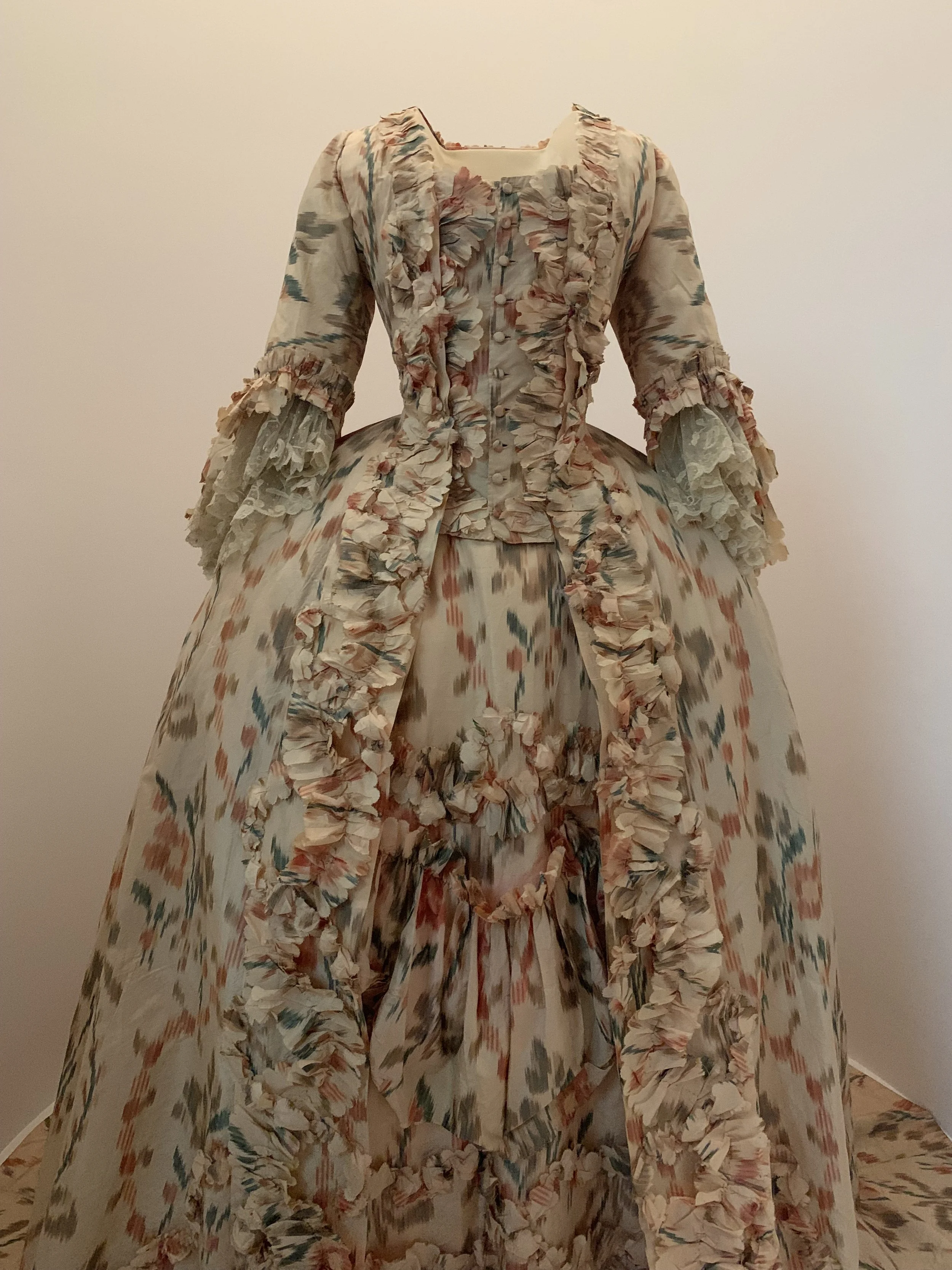 Some gowns are displayed laying down because of their fragility.